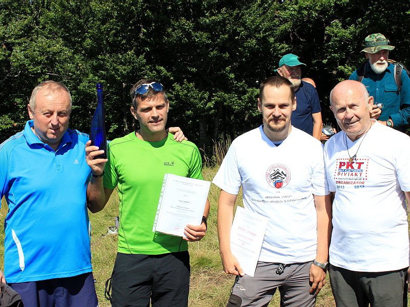 | V rámci spoločenského programu na vrchole Drienka 1268m odovzdal podpredseda Klasifikačnej komísie Klubu Slovenských turistov Štefan Hudák (vpravo) spoločne s primátorom Mesta Turčianske Teplice Igorom Husom (prvý z ľavej strany)Jozefovi Krnáčovi zo Zvolena (v zelenom tričku) bronzový odznak TTO Najvyššie vrcholy Slovenských pohorí a Radovi Červienkovi z Detvy zlatý odznak Najvyššie vrcholy Slovenských pohorí za absolvovanie výstupov na najvyššie vrcholy všetkých Slovenských pohorí. Gratulácie a potlesk od prítomných turistov obom určite pripomenuli tu obrovskú námahu, množstvo času, ale aj prostriedkov, ktoré museli obetovať na dosiahnutie tohto úspechu. | |