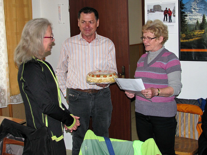 A je to tu: Ľubka Bugošová, vľavo, prijíma od Emila Kotiána nádhernú tortu a Vierka Bellanová prednáša smerom k nej špeciálnu, osobne skomponovanú častušku, k Ľubkinmu krásnemu výročiu narodenín - k Päťdesiatke.