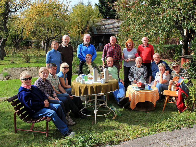 | Na ulici Slobody v Turčianskych Tepliciach. Po doplnení kalórií chutným Gabikiným ananasovo-salámovo-syrovým šalátikom, po občerstvení sa prítomných to červeným vínkom, to pivkom, to našou JDZ (Jubilejnou Diviackou Zázvorovicou), ale na stole sa "našla" aj minerálka, aby nikto nepovedal, viete??? A nesmiem zabudnúť ani na výbornú kávičku (aby to nebol "sprostý výlet", však Vierka?). Aj na tomto obrázku vidieť iba samu spokojnosť a pohodu. Pred rozlúčkou ešte nezabudnem poďakovať našim členom za účasť na tejto brigáde a zaželať všetkým, aspoň do ďalšieho nášho stretnutia - bezstarostný život. Za takmer päťročných aktivít SENIORKLUBU PKT Diviaky, bola dnešná účasť členov na podujatí suverénne najpočetnejšia. Na obrázku je týchto 16 seniorov (chýba len náš primátor Igor Hus, ktorý už má, napriek tomu, že je sobota, svoje úradné povinností): od ľavej strany sedia Hanka Uhrínová, Vierka Bellanová, Emil Kotián, Anka Štefková, Elenka Suchá, Števo Suchý, Peter Lesay, Bolek Vričan, Majka Urbanová a Laco Smolen. Postojačky sa na záverečnom fototermíne zúčastňujú (tiež od ľavej strany) Gabika Mažáriová, Jožko Mažári, domáci pán - hostiteľ, Maťo Bugoš, Jozef Kollár, Marietka Bernátová a prezident Štefan Hudák. Aby som dnešný deň takto zdokumentoval, musel som sa cestou aj trochu "šanovať" a doma ešte nejaký čas pracovať s počítačom - aby ste si mohli aj v budúcnosti oživiť spomienky na dnešnú sobotu. | |