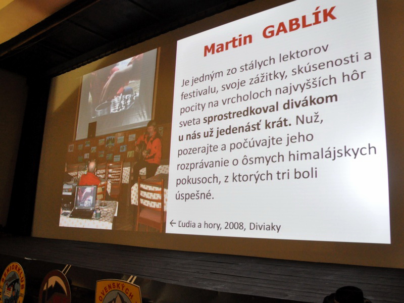 | Rodený handlovčan, momentálne s trvalým pobytom pod Pustým hradom Martin Gablík je už roky pravidelným lektorom na našich Festivaloch Ľudia a hory. V období rokov 1996 až 2011 bol členom ôsmich výprav na osemtisícovky. V roku 1996 sa pokúsil o vrchol Mount Everestu 8848m. Na túto tému neskôr lakonicky podotkol:...tomu sa hovorí "odvaha nič netušiaceho". O rok neskôr sa vybral na Kančendžongu 8586m, kde dokráčal až do výšky 8300m. V rokoch 1998 a 2005 sa pohyboval v tesnej blízkosti Broad Peaku 8047m. Až rok pred jeho päťdesiatkou, v roku 2002 sa zadarilo naplno, keď sa zastavil po prvý raz v živote na vrchole osemtisícovky, na Makalu 8463m. Bol to prvý výstup Slováka na Makalu - bez použitia prídavného kyslíku. | |