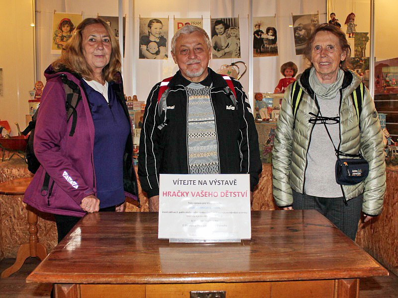 Na hrade je aj expozícia "přímo pro senióry". Tu sme sa zdržali asi najdlhšie z celej prehliadky. Z ľavej strany Marietka, Peťo a Gabika.