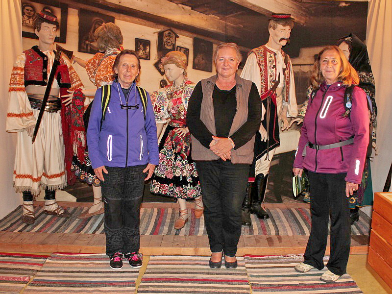 | Izba tradícií Očovej, ktorú sme si v spriedode E. Chabadovej tiež navštívili. Tu nás (teda dievčeniec) zaujali krásne očovské kroje. Tiež sme tu zistili, že Očová patrila historicky do Vígľašského pánstva a odjakživa že to bola veľmi bohatá obec. Z ľavej strany G. Mažáriová, pani Chabadová a M. Bernátová - pri prehliadke Izby tradícií Očovej. | |