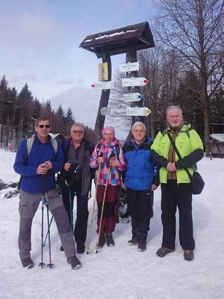 | Aj v roku 2019 sa diviacki turistickí senióri v dôstojnom počte zúčastnili tentoraz už 29. ročníka ukončenia zimnej turistickej sezóny na Skalke 1232m. V centre tunajšieho lyžiarského areálu zorganizovali aj foptotermín, z ľavej strany Ľubo Bellák, Bolek Vričan, Gabika Mažáriová, Peter Lesay a Martin Bugoš. | |