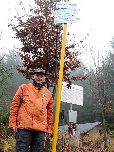 Fototermín: Števo Hudák pri informačnom paneli Partizánske zemlianky nad Valčianskou dolinou. Je mi už dosť "zimno"?!, ale - držím sa. Veď partizánom tu bolo svojho času ešte podstatne otupnejšie.