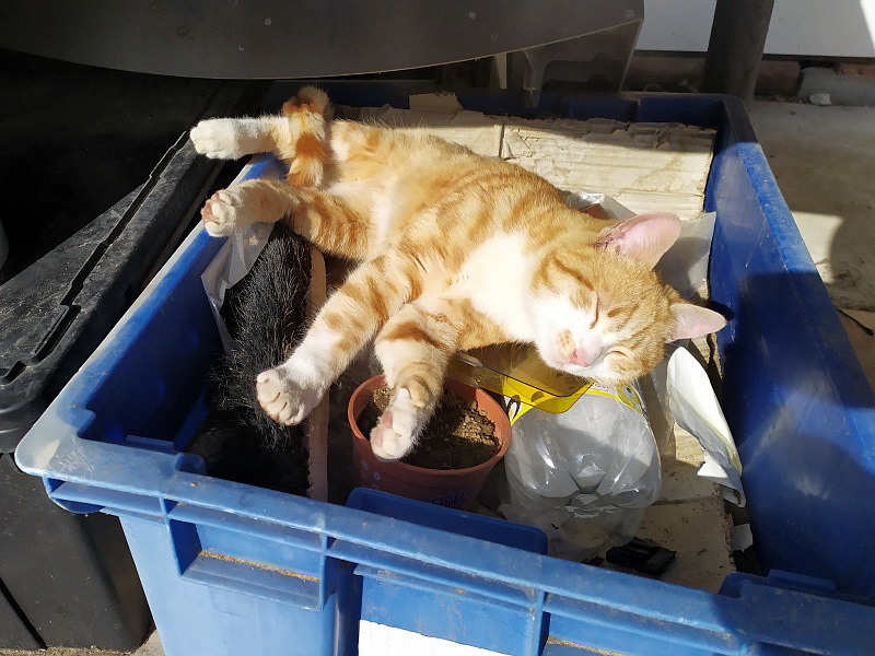 Štvrtok bol naozaj pekný deň. Po pristáti na Teplickej ulici som pred garážou našiel nášho Riška pri takejto sieste. Napapaný sa takto vyhrieval na jarnom slniečku.