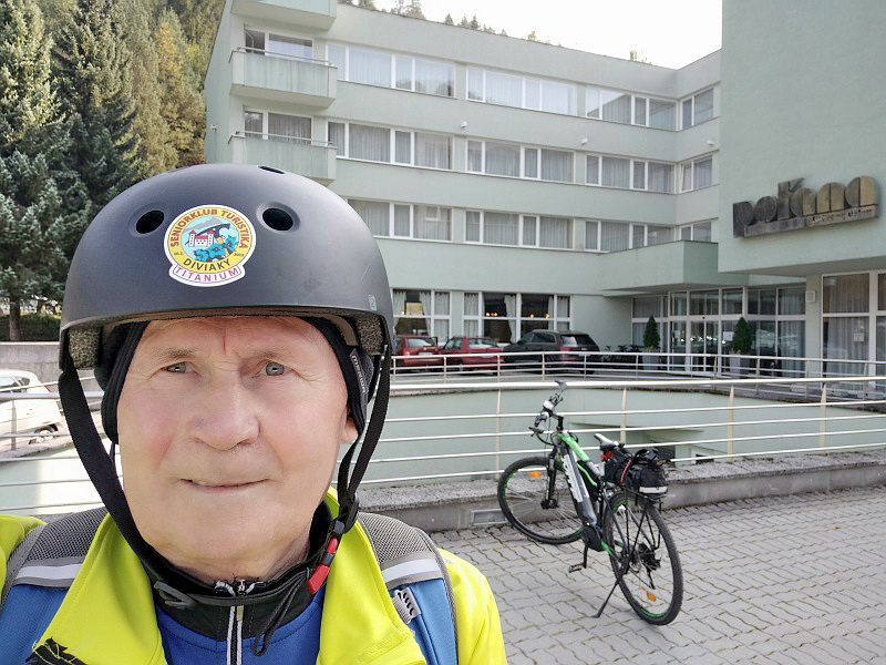 | Spiatočna cesta mi potom ubiehala o poznanie rýchlejšie, ako keď som sa "trepal" hore, do Brezna. Až som dorazil na pomerne komplikovanú križovatku do Kúpeľov Brusno 410m. Tak tu som ešte v živote nebol, nemôžem tie kúpele prosto iba tak obísť. Navyše, keď mesto Turčianske Teplice má s Brusnom, po starom povedané - družbu, či?? Na obrázku Števo Hudák pred kúpeľným domom Poľana 455m. Tu sa o túto stavbu pred časom osočovali dve mafiánske grupy. | |