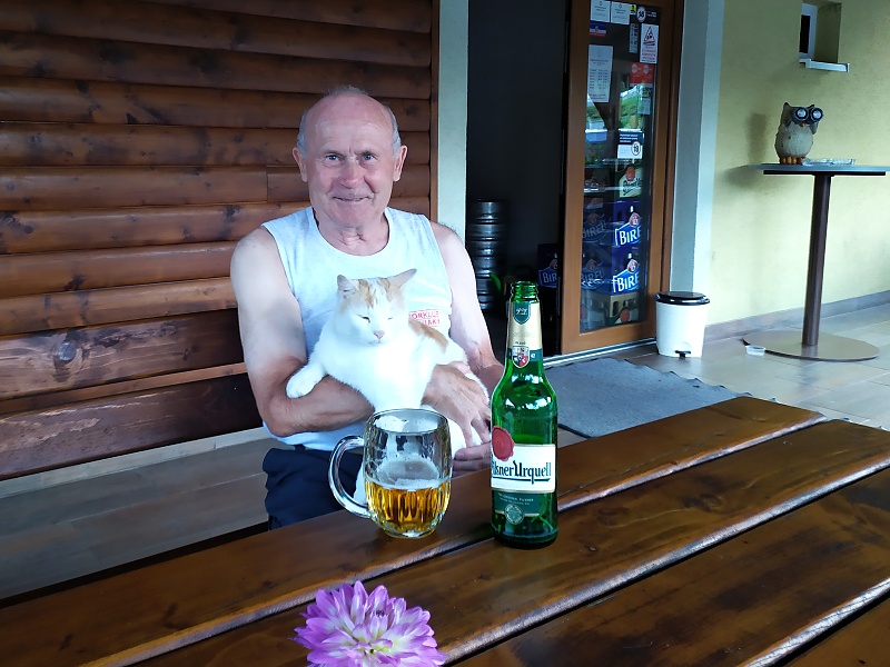 | Števo Hudák pri meditácii pred útulným penziónom Ľudmila v Kalinove 430m spolu s krásnym kocúrikom Garfieldom. Je 18,45 h. a ja som tu mal byť spolu s Marietkou o cca 15,00 h. s tým, že do cca 20,00 h. navštívime to jubilejné 20. Utajené miesto, nainštalujeme na ňom vrcholovú tabuľku a vrátime sa k občerstveniu do tohto penziónu. | |
