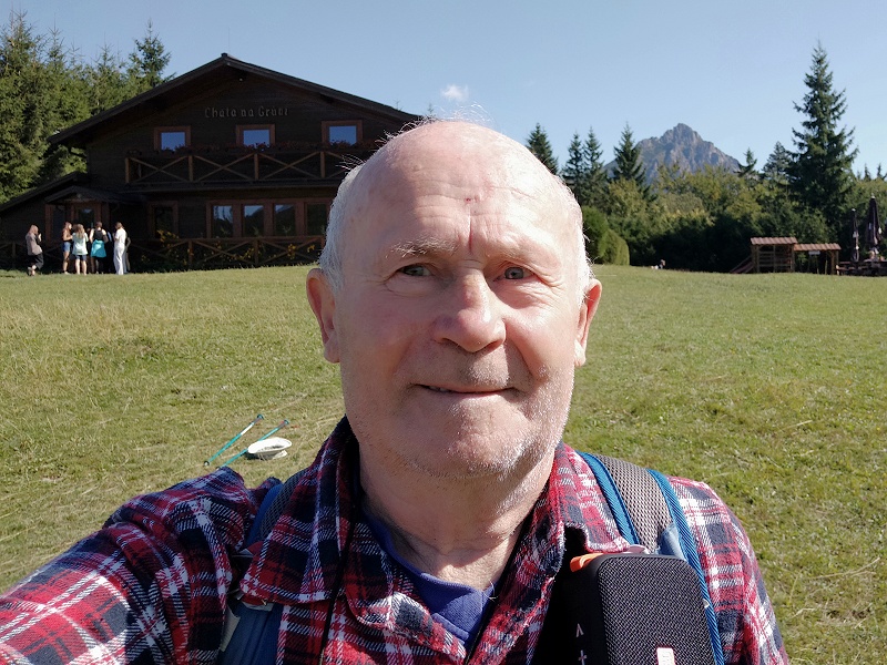 A ešte raz, detail: Števo Hudák na Grúni 970m. Nad ľavým ramenom má Veľký Rozsutec 1.610m a nad pravým ramenom zase chatu na Grúni.