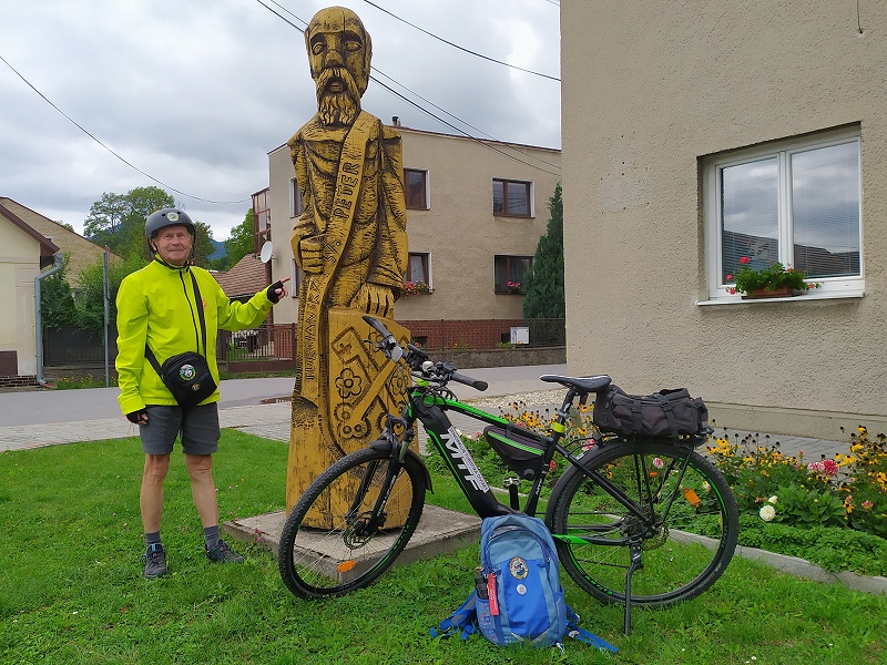 Števo Hudák v Turčianskom Petri. Nastala tu však dilema. Nie je mi jasné, či to, na čo ukazujem ukazovákom je svätý Peter alebo Turčiansky Peter. Keďže Obecný úrad je mimo prevádzky, tak nechcem obťažovať starostu telefónom aby mi to vysvetlil. Ale...zastavím sa tu aj v októbri a...možno bude Úrad v prevádzke. | ![]() |